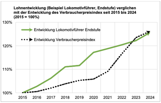 Trotz der deutlichen Entgelterhöhungen, welche die GDL in der vergangenen Tarifrunde vereinbart hat, konnte der Reallohnverlust, bedingt durch die hohe Inflation, nicht wieder ausgeglichen werden. Sie betrug 2022 und 2023 in Summe fast 13 Prozent.
