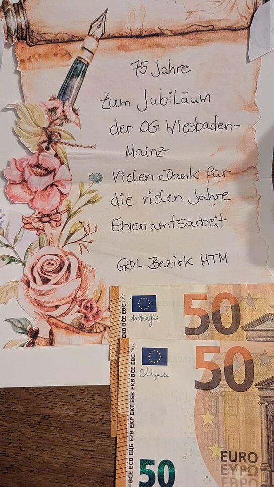 Am 28. September 2024 feierte die GDL-Ortsgruppe Wiesbaden-Mainz ihr 75-jähriges Jubiläum im Schützenhof in Wiesbaden-Biebrich. Rund 50 Mitglieder der Gewerkschaft Deutscher Lokomotivführer (GDL) sowie deren Angehörige nahmen an der festlichen Veranstaltung teil. Zur Eröffnung verlas Kassierer Viktor Neugebauer das Gründungsprotokoll (siehe unten) der Ortsgruppe. Der Ortsgruppenvorsitzende Michael Rösgen und sein Stellvertreter Markus Fahrein begrüßten herzlich die anwesenden Mitglieder und ihre Familien.