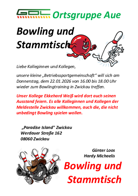 unsere kleine „Betriebssportgemeinschaft“ will sich am Donnerstag, dem 19.03.2026 von 16.00 bis 18.00 Uhr wieder zum Bowlingtraining in Zwickau treffen. Schuhe bekommen wir dort. Es sind auch alle Kolleginnen und Kollegen am Stammtisch willkommen, die nicht unbedingt Bowling spielen wollen. Ab 18.00 Uhr können wir dort die verbrauchten Kalorien mit einem leckeren Abendessen ergänzen.