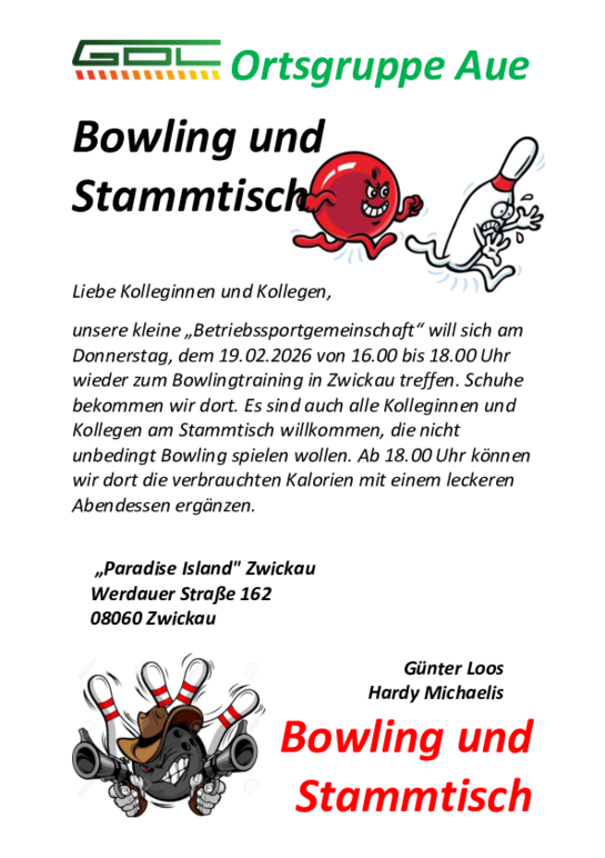unsere kleine „Betriebssportgemeinschaft“ will sich am Donnerstag, dem 19.02.2026 von 16.00 bis 18.00 Uhr wieder zum Bowlingtraining in Zwickau treffen. Schuhe bekommen wir dort. Es sind auch alle Kolleginnen und Kollegen am Stammtisch willkommen, die nicht unbedingt Bowling spielen wollen. Ab 18.00 Uhr können wir dort die verbrauchten Kalorien mit einem leckeren Abendessen ergänzen.