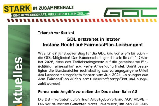 Am 1. Oktober 2025 urteilte das Bundesarbeitsgericht zugunsten der GDL-Mitglieder und untermauerte das erste Urteil des LAG Hessen. Das Ergebnis: Das Tarifeinheitsgesetz findet KEINE Anwendung auf die gemeinsame Einrichtung FairnessPlan e.V.