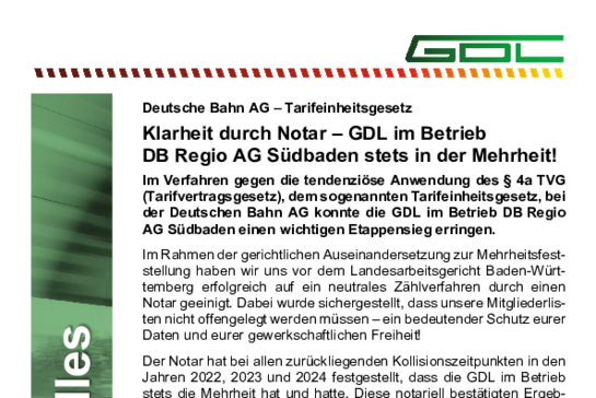 Die GDL hat mithilfe eines Gerichts einen entscheidenden ersten Schritt gegen die willkürliche Zuordnung in einem DB Betrieb erreicht. Ein Notar soll nun ein neutrales Zählverfahren durchführen. Bereits zu vorhergegangenen Kollisionszeitpunkten hatte ein Notar festgestellt, dass die GDL in diesem Betrieb stets die Mehrheit hatte. Erfahre im folgenden Dokument mehr darüber.